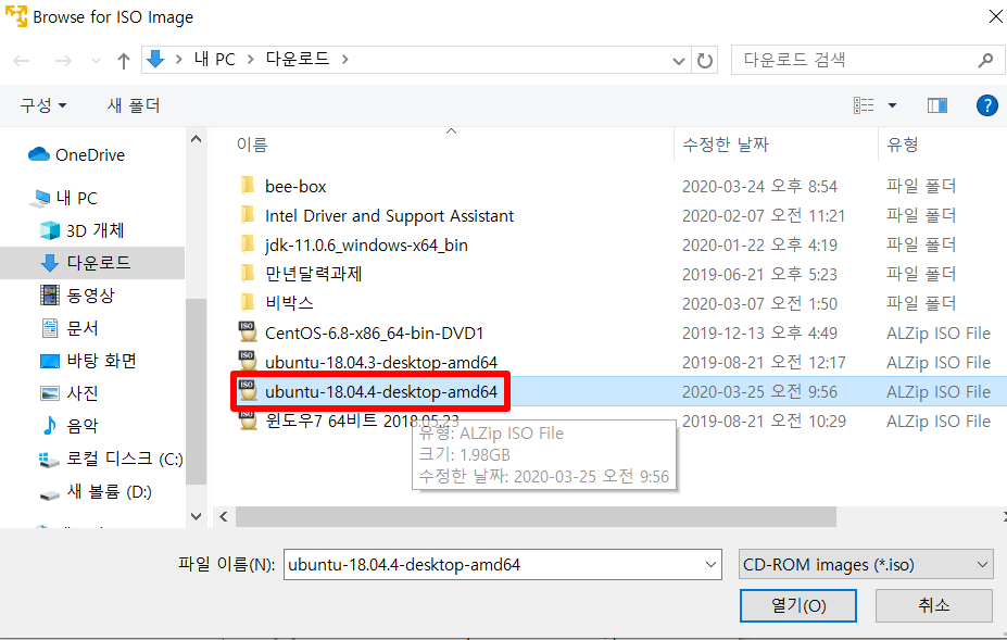 4.다운받은 우분투의 경로에 들어가 찾아서 넣어줍니다!