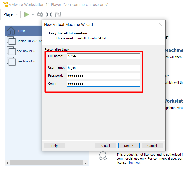 "Full name"은 가상 머신에 설치되는 우분투 리눅스의 시스템 이름을 보여줍니다!