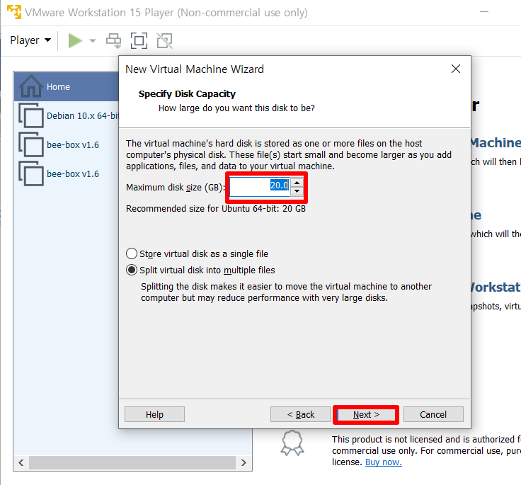 8.가상머신에게 용량을 얼마나 줄건지 묻는건데요, 무거운 프로그램을 돌리실게아니라면 디폴트 설정값인 20GB로 하시면 됩니다!