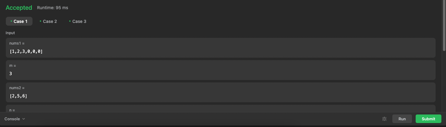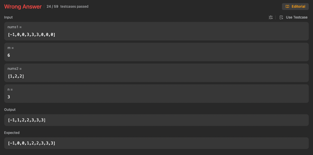 정리된 nums1 배열과 nums2를 병합 후 오름차순으로 정렬하면 해당 문제의 testcase를 모두 통과 할 수 있었다.