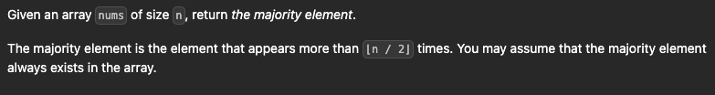 우선 과반수의 배열이 넘어오는 온다는 건, 같은 개수의 값이 넘어올 일이 없다는 것이다.