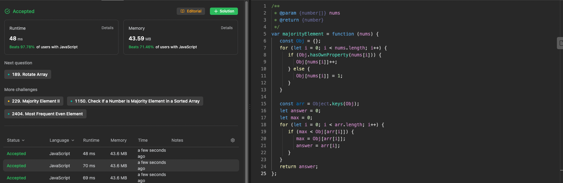 배열의 중간값은 무조건 과반수의 값이 될 수밖에 없다는 점을 이용한 풀이 방법이다.