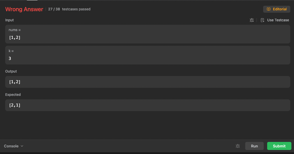 내가 작성한 코드는 k는 nums의 배열보다 작을 경우를 생각 해 작성 한 코드이기에 다른 테스트 케이스를 통과하지 못한것이다.
