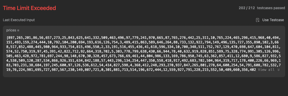 하지만 전체의 212개의 testcase 중 200개밖에 통과를 하지 못했고, 풀이하는데 있어 코드 자체는 문제가 없으나,