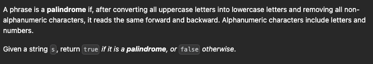 2) 투포인터 방법으로 문자열의 왼쪽과 오른쪽을 좁혀가며 비교해 하나라도 다른 문자열이라면 false를 반환하고 아니라면 true를 반환하는 방식을 사용했다. 확실히 투포인터의 원리에 대한 수업을 듣고 문제에 접근하니 훨씬 쉽게 풀 수 있었다.