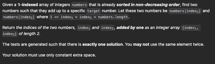 만약 number[left]와 number[right]를 더한 값이 target과 같다면 left와 right의 값을 1씩 더해 리턴해 문제를 풀었다.