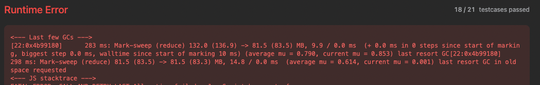 하지만 전체의 21개의 testcase 중 18개밖에 통과를 하지 못했고, 타임아웃에 걸려 문제를 풀지 못했다.