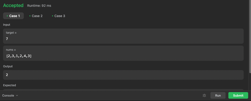 즉 2,3,1,2를 더한 값은 8이고 sum -= nums[left]를 통해 3,1,2 또한 target보다 큰 값이 될 수 있는지 비교한다.