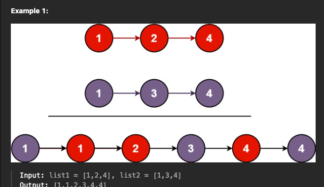그 후 list1의 노드 혹은 list2 노드가 존재할 때까지 반복문을 수행하며,