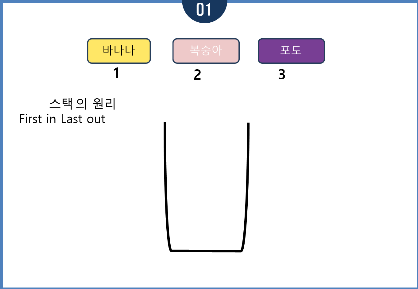 바나나,복숭아,포도가 들어있고 순서대로 바나나 -> 복숭아 -> 포도 순으로 스택안에 들어갑니다.