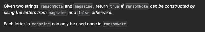 그 후 ransomNote 데이터를 반복문을 돌며 obj 객체에 해당 데이터가 없으면 false를 리턴하고 아니라면 값을 하나씩 뺀다.