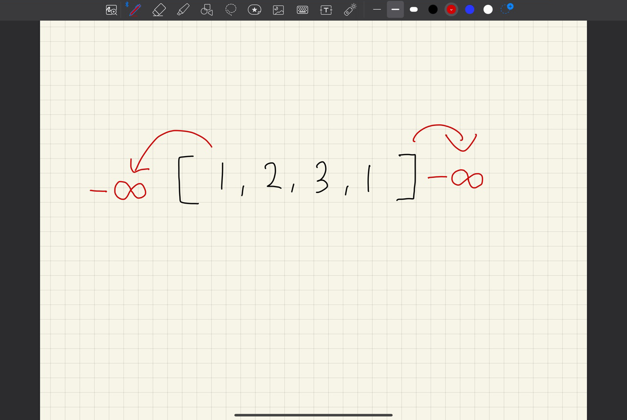 이렇게 해도 되는 이유는 nums[-1]과 nums[n] 인덱스는 -Infinity 값을 가지기 때문에 배열의 맨 끝까지 가게 되면 어차피 최솟값과 요소의 값을 비교하기에 무조건 양옆보다 큰 요소가 나온다.