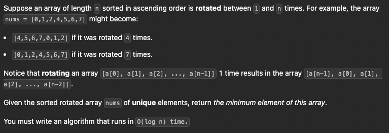 만약 start가 end보다 작거나 같다면 해당 배열은 정렬이 되어있다는 의미로 while 문을 탈출해 nums[start]를 리턴해 정답을 풀이한다.