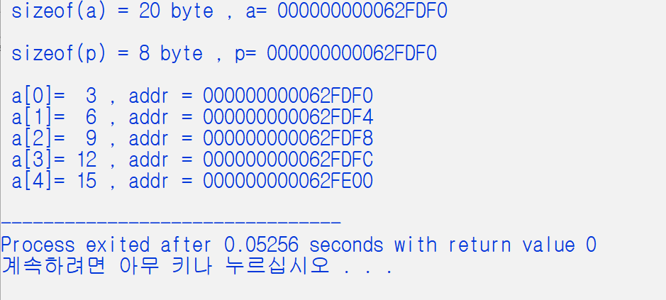 //printf(" a[%d]= %2d , addr = %p \n", i, a[i], &a[i]); //4개모두 표현이 같다.