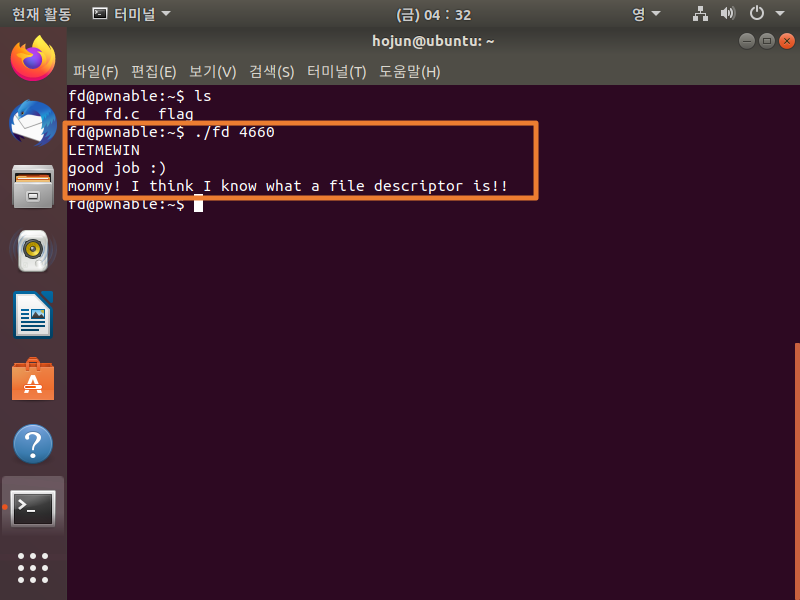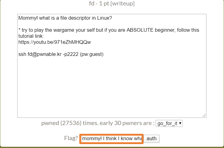 flag 값인 mommy! I think I know what a file descriptor is!! 를 알려줍니다!