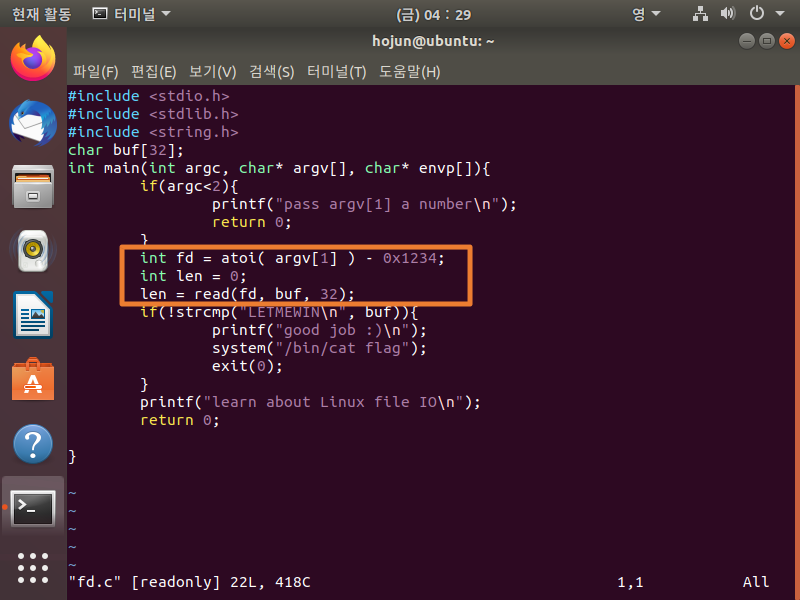 atoi(argc [1])의 인자는 int로 반환되어 0x1234와 뺄셈을 하여 fd변수에 값이 들어갑니다.