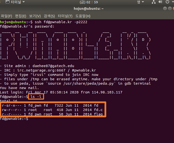 fd.c 파일은 파일 소유자가 root이고, other는 r-- 이기때문에 저희는 읽을 수만 있는 권한입니다.