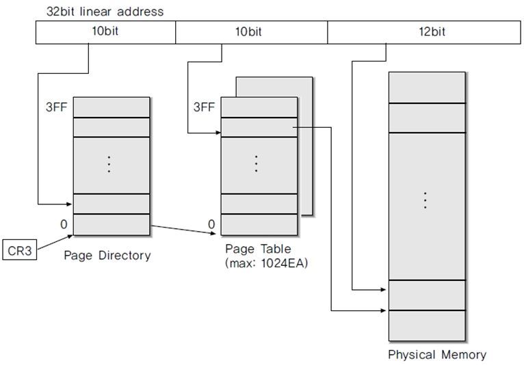 1. 페이지 디렉토리는 각 테스크마다 하나씩 할당되며 10bit를 가지므로 1,024개의 엔트리를 갖습니다.