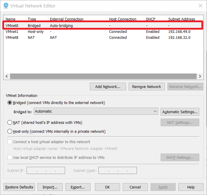 맨 처음에 VMware Virtual Network Editor을 누르게 되면 VMnet0이 없는걸 확인할수없습니다.
