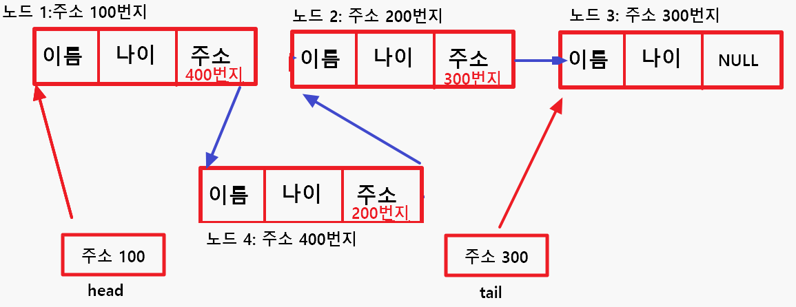 노드1의 포인터가 노드4를 가르키고 노드4의 포인터가 노드2를 가르키면,