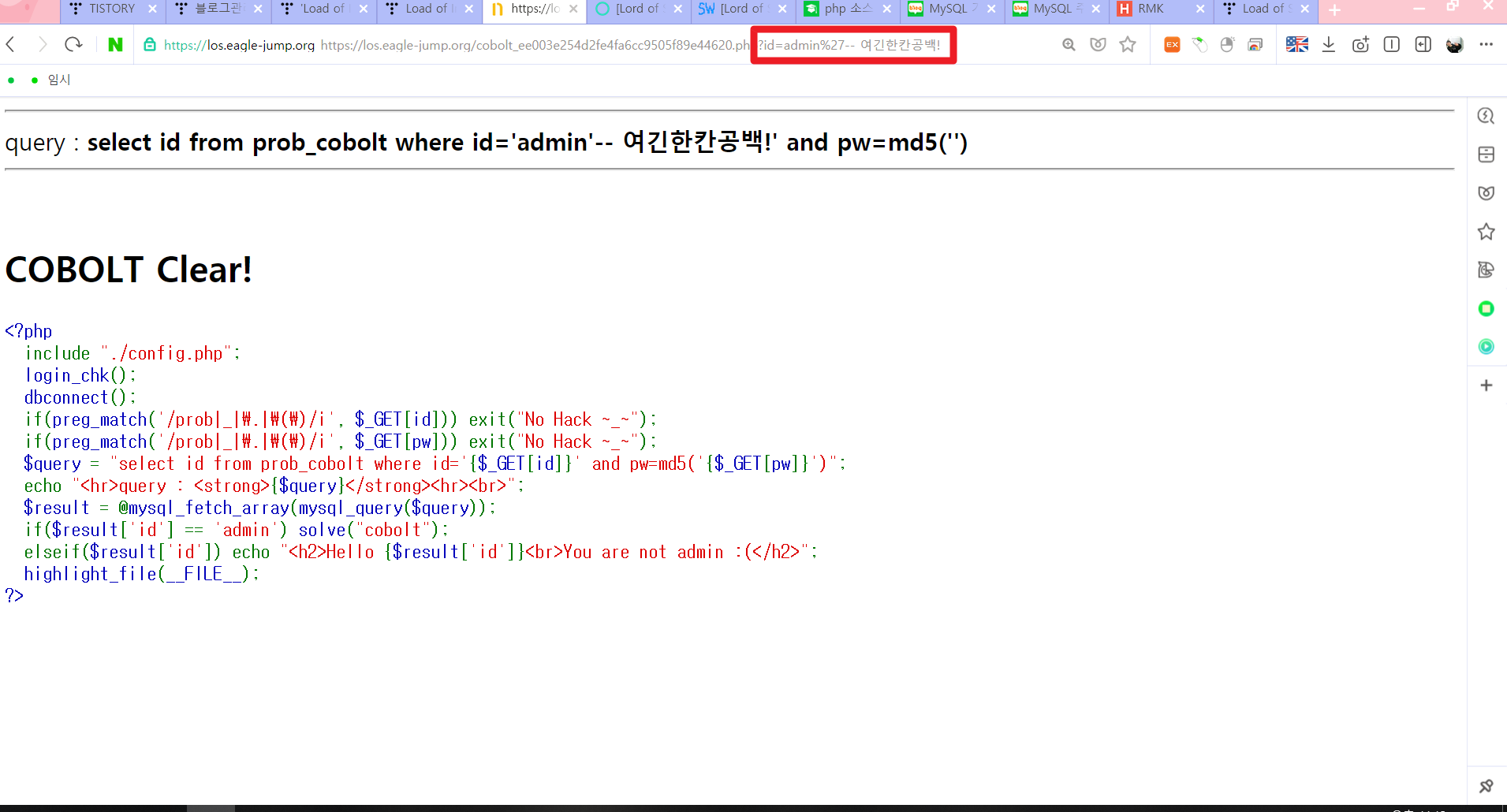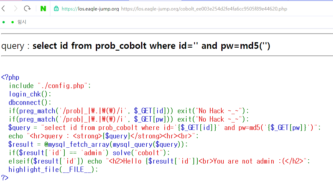 이번엔 2단계 cobolt이다 1단계와 비슷하게 id와 pw 값에 prob, _(언더바) , ( ) 가 오면 No Hack ~_~ 가 뜬다..