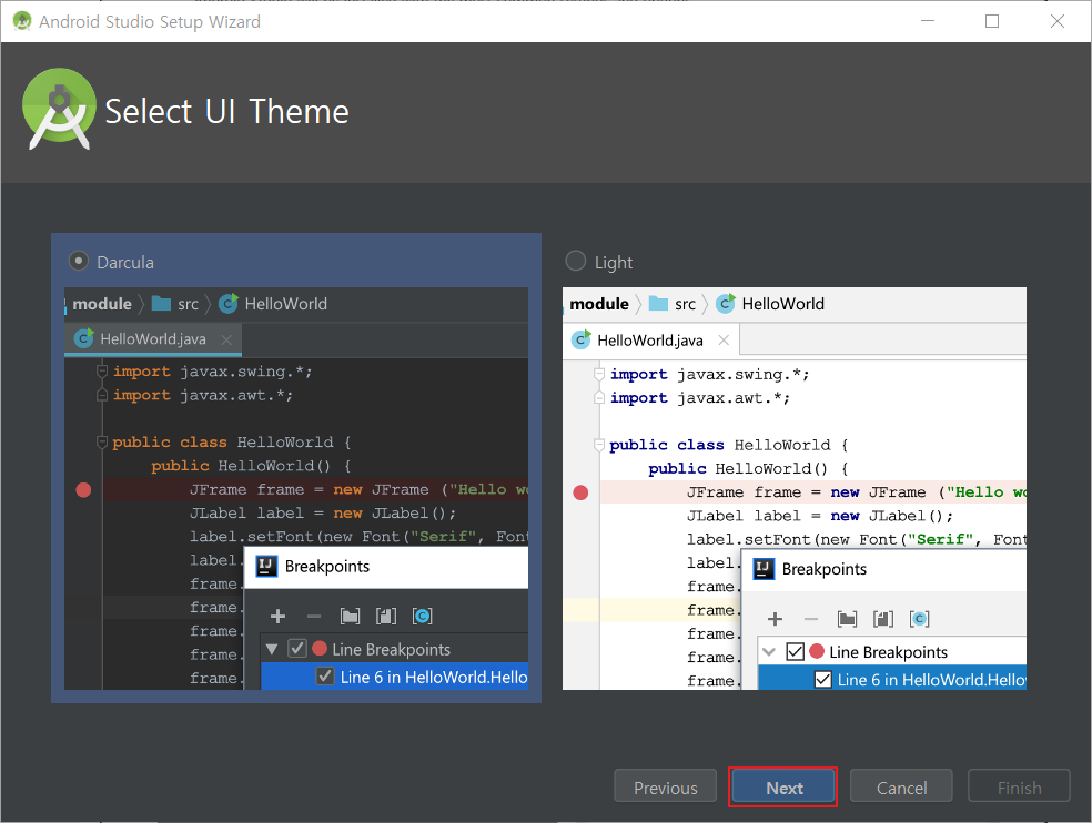 2-1 안드로이드 스튜디오에서 사용할 유저 인터페이스 테마를 선택합니다.