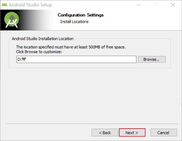 4. 안드로이드 스튜디오의 설치 위치를 원하는 곳으로 변경 가능합니다.