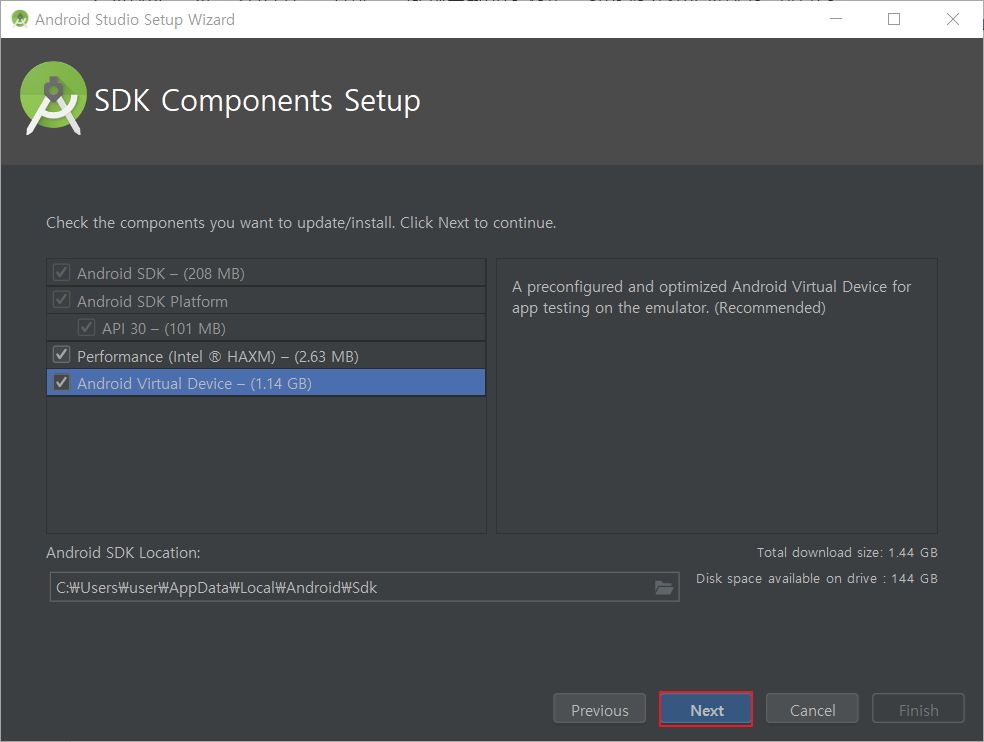 안드로이드 에뮬레이터를 사용할 예정 이라면 Performance( Intel HAXM )과 Android Virtual Device를 선택 합니다.