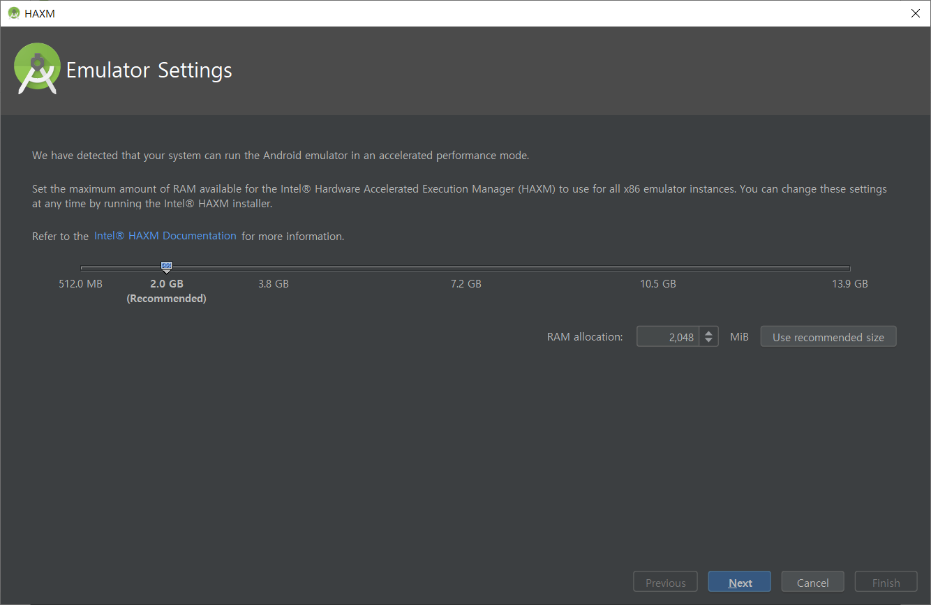 4. Performance( Intel HAXM )를 선택했다면 에뮬레이터 가속을 위해 사용할 메모리 양을 물어봅니다.
