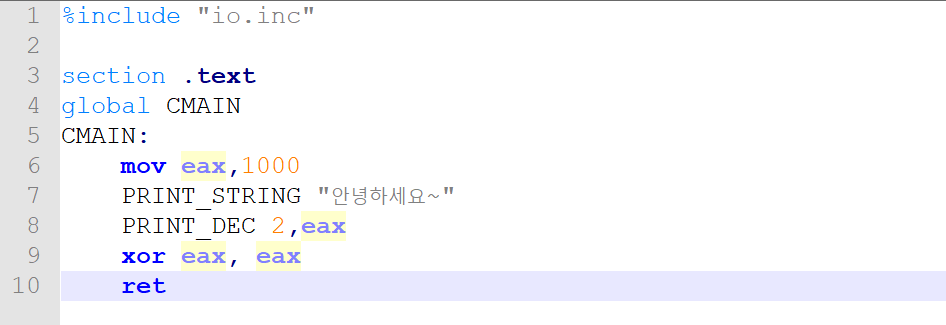 그럼 모든 준비가 끝났습니다. 테스트로 간단한 출력문 어셈코드를 한번 짜봅시다.