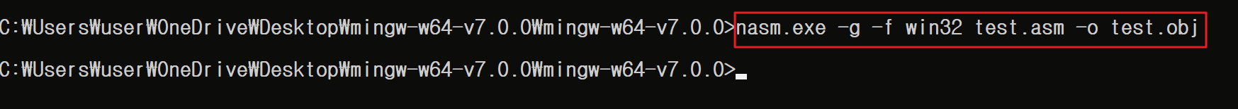 test.asm(소스파일) ---> nasm.exe(어셈블러)를 통해 ---> test.obj(중간파일)로 변경됩니다. ---> 이것을 gcc.exe(링커) 가 ---> test.exe(실행파일로 만들어짐)