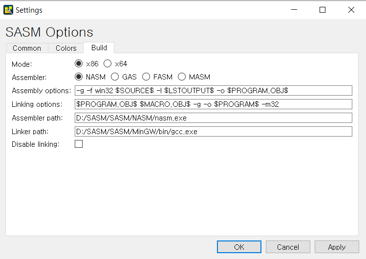 위의 사진에서 링킹 경로와 nasm.exe 경로 등등 설정해주면 sasm 환경에서 진행하면됩니다.