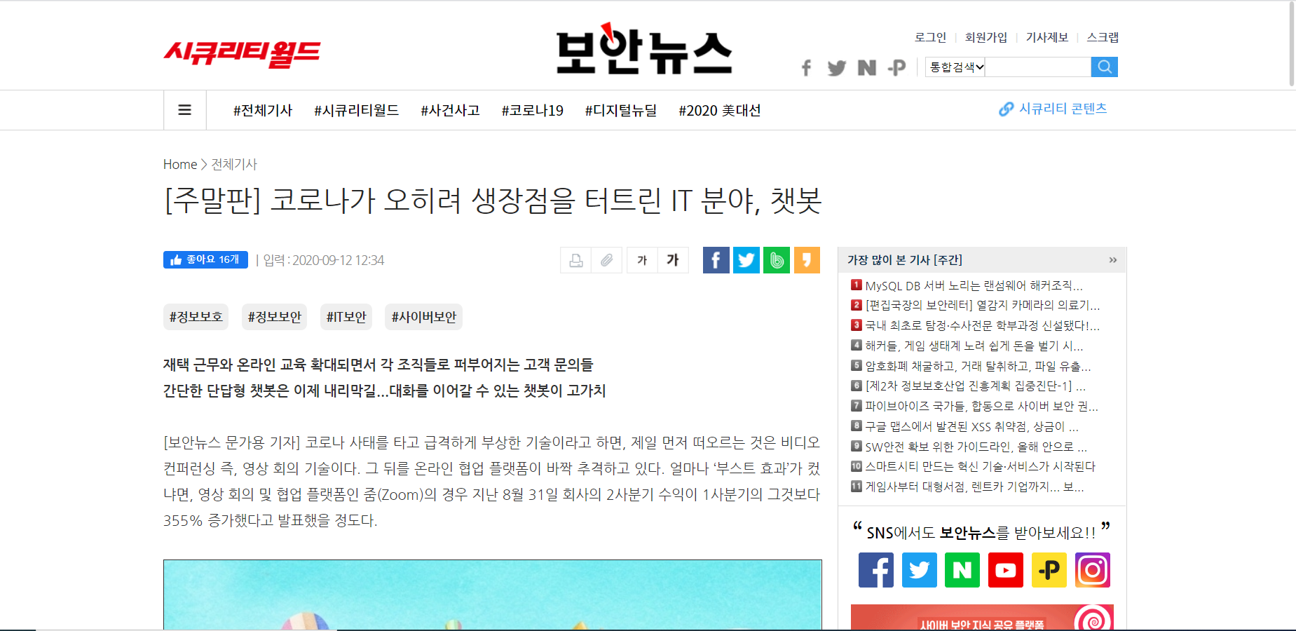 [보안뉴스 한줄요약] 코로나가 오히려 생장점을 터트린 IT 분야 챗봇. 본문